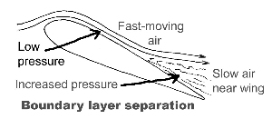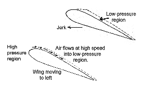 (By the way. Air is a lot heavier than most people think. A big, empty refrigerator holds almost 2 pounds of air, and you will need to be a pretty strong person to lift the air in a room ... assuming you can get a handle on it.) If the wing is initially stationary before we jerk it, and then after being jerked to the left, it just sits there and waits for the air to refill the empty space, the air will tend to flow straight in toward the top surface of the wing, more or less at right angles to the wing. And that will be about all there is to it. It may bounce around a little as it settles down, but no significant movement down the wing toward the trailing edge will occur. Moving wing But if the wing is moving through the air with considerable speed to the left, the situation is somewhat different. We can imagine the movement of the wing to consist of a very large number of small jerks, but in this case, a pronounced high pressure region will develop up near the leading edge. So what will we have? An empty space (low pressure) distributed along the top of the wing, air trying to refill it (nature abhors a vacuum), and a high-pressure region up to the left, near the leading edge. So what will happen? The Punch Line: The high pressure near the leading edge will force the air in that region to flow toward the empty space at the top of the wing. The motion of the air will be very nearly parallel to the surface of the wing. And because the air is being forced to flow by the high pressure, it will pick up speed. The result is that the air flowing over the top of the wing will travel much faster than the air flowing under the wing. Question: Why doesn't the high pressure in front of the wing cause the air flowing under the bottom to speed up as well? There is no empty space or low pressure area created under the bottom of the wing (at least to the extent that it is created on the top). Question: Why doesn't the air just take the shortest route and flow into the empty space by traveling at right angles to the wing? Well, to an extent, it does. But remember, the high pressure region in front of the leading edge will have a pressure just a bit higher than the pressure above the wing back toward the trailing edge. The actual path taken by the air will consist of the parallel and perpendicular components added together. The component parallel to the wing will predominate, but its effect becomes less as we proceed toward the trailing edge. In fact, the pressure is somewhat higher back near the trailing edge in part because of the diminished effect of the high pressure at the front, together with the inflow of air at greater angles to the wings surface. Question: In Denker's diagrams, there's no big puddle of high-pressure air up above the leading edge. Why not? As the angle of attack increases, the stagnation point at the leading edge moves downward toward the bottom of the wing, even to a point that is aft of the very front of the leading edge. Nevertheless, the effect of the high pressure is the same. In fact, from the stagnation point, air will flow forward a short distance as it rounds the end of the wing cord and finally starts its journey to the rear. High angle of attack As the angle of attack becomes greater, it becomes more difficult for the air to "turn the corner" on top of the wing up near the leading edge. This diminishes the flow of air parallel to the wing, and in fact, the stream of air having the highest speed may become separated a considerable distance from the wing.