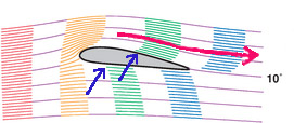Here's another tidbit. The streamlines will curve away from a region of high pressure and curve toward a region of low pressure. By noting the curvature, you can tell where the regions of high and low pressure are. Look at the first streamline above the wing. Ahead of the leading edge, it is curving upward. Above the leading edge, it is curving downward. Back near the trailing edge, it is curving upward again, but rather gently. What this shows is that there is a region of high pressure just in front of the leading edge, there is a region of low pressure just above the center of the wing, but the pressure above the wing increases somewhat near the trailing edge because the streamline begins to curve upward again.