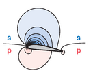From measurements taken from the diagram, it appears that the front edge of the blue smoke passing over the top is about 2 feet 5 inches beyond the trailing edge by the time the blue smoke at the bottom gets to the trailing edge. And, this displacement is permanent. The air does not rearrange itself back to its original state after the wing is long gone. So much for the traditional wisdom that "the air meets up properly!" 2. Zero slip, Boundary layer, and Maximum Speed This section gives a little background information. Skip it if you already know what a boundary layer is, and so forth. Here's a link to the appropriate section in Denker's book. However, few diagrams are present. A basic principle in the flow of fluids (whether air or a liquid) over a surface is that the part of the fluid that is in actual contact with the surface does not move relative to the surface. It just sits there. This is known as the condition of "zero slip." What this means for air flowing over a wing is that there is a very thin layer of air near the wing that doesn't move at all. However, just a tiny fraction of an inch from the surface, the air will be moving, but still not as fast as it will be just a bit farther out. This layer in which the speed varies from zero up to the speed that the air has that is well away from the surface is called the "boundary layer." In many instances, the boundary layer will be no thicker than the thickness of a dime. Nevertheless, the effect is there and it contributes to the fact that the wing tends to drag the air along with it, to some extent. In the diagrams, the columns of smoke that tend to lean to the left show where the air is being dragged along with the wing.