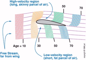 Why does the air passing over a wing speed up? If we can understand this, we can then apply Bernoulli's law and understand how a wing produces lift. My primary source of information is John S. Denker's on-line book, Chapter 3. Here's the link: 1. Air has to travel farther over the top. A widely-published explanation is that the air passing over the top of a wing has farther to travel than the air flowing under the bottom of the wing. Therefore, in order for the air to meet up properly at the trailing edge, the air flowing over the top must flow faster. This is not correct. True, air flowing over the top must travel farther. However, the explanation is based on the assumption that the two streams of air do indeed meet up "properly" at the trailing edge. This does not happen. In fact, the air traveling over the top, in most cases, will get to the trailing edge BEFORE the air flowing under the wing! And the race is not even close. By what percentage is the path over the top greater than the distance under the bottom? Measuring one of Denker's airfoils, I came up with 7.5%. It is definitely less than 10%. Based on this, the increase in speed required for the air to "meet up properly" would be greater by about the same percentage. However, to quote Denker, "The maximum velocity produced by this wing at this angle of attack is about twice the free-stream velocity." In Denker's diagrams, he is simulating a wind tunnel with smoke injected into the flow. That is, the wing is stationary with the air and smoke flowing past it. I prefer to view the same diagrams as having the air and smoke stationary and letting the wing fly through it. So, imagine the wing to be flying from right to left and passing through bands of smoke. The two views are actually equivalent but I'm more comfortable having the airplane doing the flying.