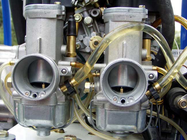 Next, look at both carbs and make sure they are parallel to each other and perfectly vertical when the head on the engine is level. If one carb is tipped or they aren't level, loosen the clamp on the rubber boot between the carb and the engine and rotate the carb(s) until they are square and level.