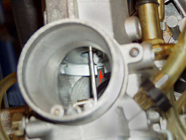 My trick is, open the throttle so that the notch on the bottom, back side, of the slide is roughly even with the top of throttle bore. (see the red arrow on the photo at left) Its okay if you see a sliver of the throttle bore showing where the top of the notch is, as depicted in the photo at left.