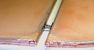 I used one of those cutoff type composition blades on my table saw to round the ends of the tubes. They are available for table saws to cut tile or other very hard material. The blades are cheap, costing less than $10. I pressed the exposed tube end of the tail section against the side of the blade and slowly ground the tube down to match the curve of the tube that was joined to it. I took the grind right down to where the tubes seemed to transition almost perfectly at the point where they meet at 90 degrees.
