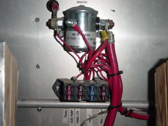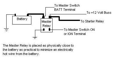For those using an electric starter, a Master Relay is suggested to isolate the battery from the (heavy current capacity) #4 wire connecting the battery to the Starter Relay. This would be recommended if your starter solenoid is more than a couple feet away from the battery, like a nose mounted battery. It's a safety consideration that, in the event of a crash, the Master Switch will be turned off, cutting electrical power to the aircraft, so if any broken or frayed wires occur, they will not be energized and possibly start a fire from sparks. The addition of a Master Relay to an existing system is easy in that the #4 wire from the battery to the Starter Relay is simply cut wherever the Master Relay is to be mounted. Those two wire ends are then connected to the Master Relay's contactor terminals and smaller wire run from the Master Relay coil terminals to the Master Switch on the instrument panel. The Master Relay is a continuous duty, 12 volt relay which is also called a solenoid. It may be purchased from sources such as Wicks Aircraft and Aircraft Spruce & Speciality for less than $20. The Master Relay should be mounted as physically close to the battery as is practical in order to minimize the length of electrically hot wiring from the battery to the aircraft's 12 volt buss and starting system. While a Master Switch by itself on the instrument panel can cut electrical power to the aircraft's 12 volt buss, it can not interrupt power to the starter circuit which is capable of carrying hundreds of amps of current and is not fused. Therefore, some sort of isolation is desired hence, the Master Relay. So, when the Master Switch on the instrument panel is turned on, it will energize the Master Relay which will not only supply power to the 12 volt buss, but to the starting circuit as well. Connection is quite simple as can be seen in the diagram. The #4 gauge wire that normally would go from the battery to the Starter Relay will now be a short piece of #4 wire connecting the battery's positive terminal to one of the contactor posts on the Master Relay. The other contactor will connect to the Starter Relay also with #4 wire. A smaller gauge wire (such as 18 gauge) will connect from the terminal going to the Starter Relay to the +12 volt aircraft buss. Another similar wire will connect from the terminal to the battery to the Master Switch's BATT terminal. One of the coil posts on the Master Relay will be grounded and the other will connect to the Master Switch's ON or IGN terminal. The wire to the Master Relay coil may be fused at 1 to 3 amps. |