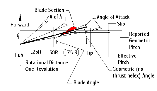 CR = 60 x 0.75 x 3.14159 GP = (102.5 x1.467 x 60 x 12) / (6,400 / 2.6) So, if you were ordering this prop, it would be designated 60 x 44. The effective pitch however would be: EP = GP x (1.000 - .16) Then the actual aircraft speed should be: Airspeed = (EP x Engine RPM x 60) / (Dr x 12 x 5280) If you want to check the pitch you have set into your ground adjustable prop, be sure to use the angle at the .75R station, you can use the following formula: