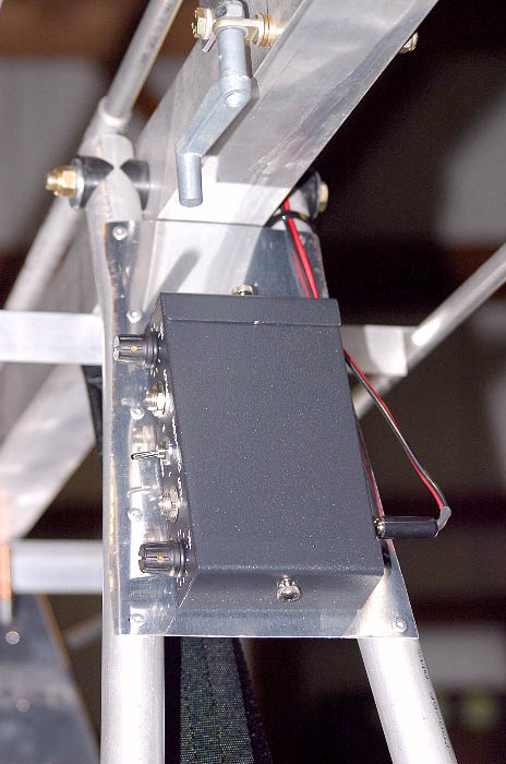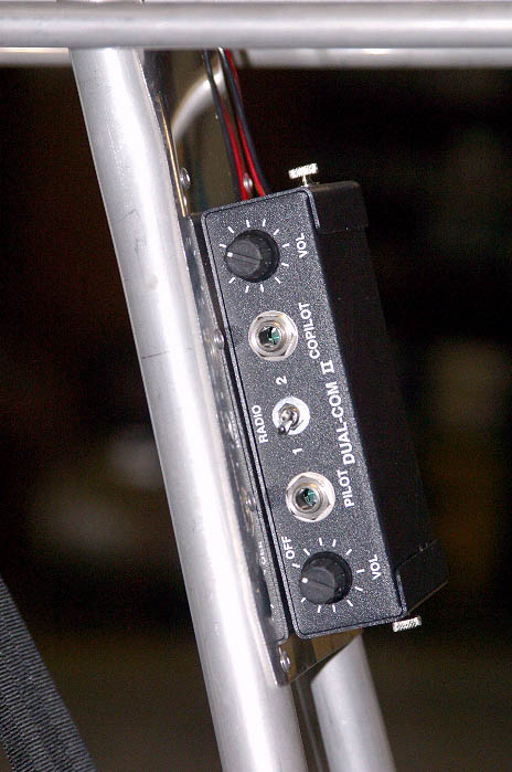Other locations for the intercom controller would be under the front seat, and facing forward to allow the pilot to adjust the volume controls, as well as, the ON/OFF button. A right-hand, side mounting also offers decent ease of adjustment to the unit's control panel by the pilot. However, both locations make it cumbersome to adjust the intercom controls, as well as, dealing with the rear headset cord in these locations. |
