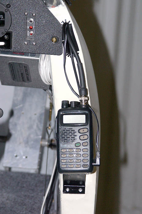 In the left photo is shown the popular Miracle Air Whip Antenna. Installation of the Miracle Air Whip Antenna is a snap. It is designed to be attached to the inside of the fiberglass nose. You can use hot glue, silicone or duct tape to install it. The Miracle Air Whip is a full half-wave dipole antenna which allows it to be pre-tuned for maximum radiation during its manufacturing process. It operates completely independent of ground planes or wires. It is also a lower cost alternative to the standard communications antenna like the one mentioned above. |