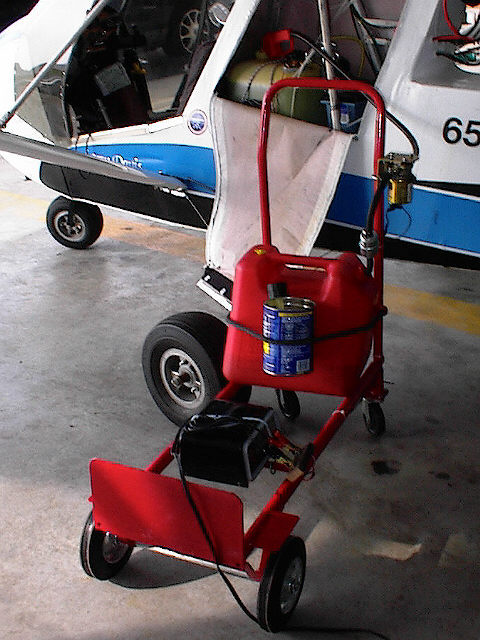 Why spend the money for this elaborate of a refueling station for your plane? Well, it's a bit pricey, but if you are sporting "wing tanks" where you need to get up on a step ladder to refill your fuel tanks, I doubt you would like it very much having to lift and try pouring fuel from a 5 gallon can into the tanks. Also, I have never seen a 5 gallon fuel can "NOT LEAK" from around the fuel spout. Don't know about you, but I sure would not like having gas running down my wings and onto the Lexan windows. Additionally, if you have the cash for this type of setup, you would be far better off using this "CLEAN" way of refueling then trying to use those leaky 5 gallon cans to refuel your bird, even for the standard 10 gallon, in fuselage fuel tank. When refueling my Challenger II, I can pump 20 gallons faster then I can pump gas at a gas station into my car. This is a really good and clean outfit for refueling your plane. Setup: |