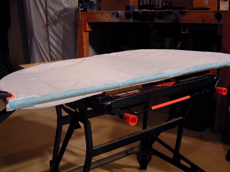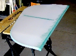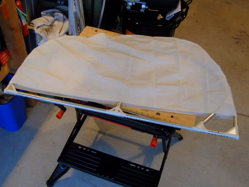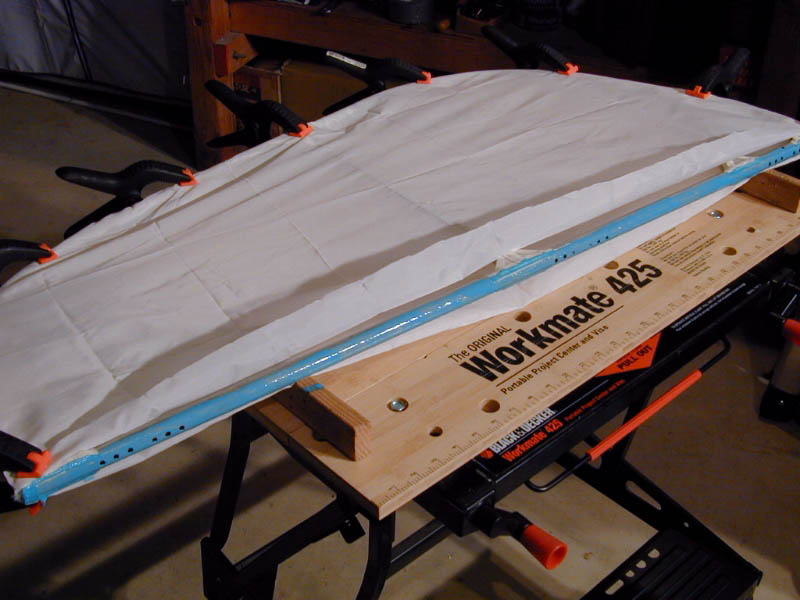 While working with the sock in preparation for gluing it to the aluminum frame, you may want to use hand spring clamps to keep the sewn seam centered on the outside edge. This would also be a good time to adjust the inner sewn seam flaps to all face toward the bottom of the tail feather from the sewn seam itself. If you allow the seam's flaps to alternate, both up and down, your tail section will not look as good or professional as they could be. |
