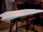Using a hot iron set at about 225-275 deg F., iron the fabric down into the glue bed by using heat and pressure. The heat from the iron softens the bed layer of glue allowing the pressure to push the fabric weave down into the glue. You should see a slight darkening of the fabric where you have heat bonded the fabric to the glue. |